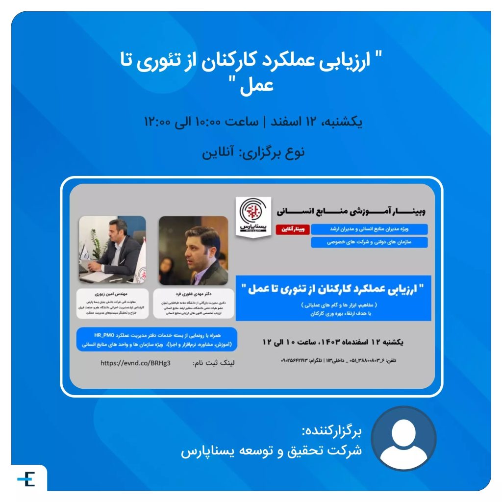به گزارش روابط عمومی شرکت تحقیق و توسعه یسناپارس، وبینار تخصصی «ارزیابی عملکرد کارکنان از تئوری تا عمل: مفاهیم، ابزارها و گامهای عملیاتی»، روز یکشنبه 12 اسفندماه 1403، با حضور جمعی از مدیران و کارشناسان منابع انسانی سازمانهای مختلف، به صورت آنلاین برگزار شد.