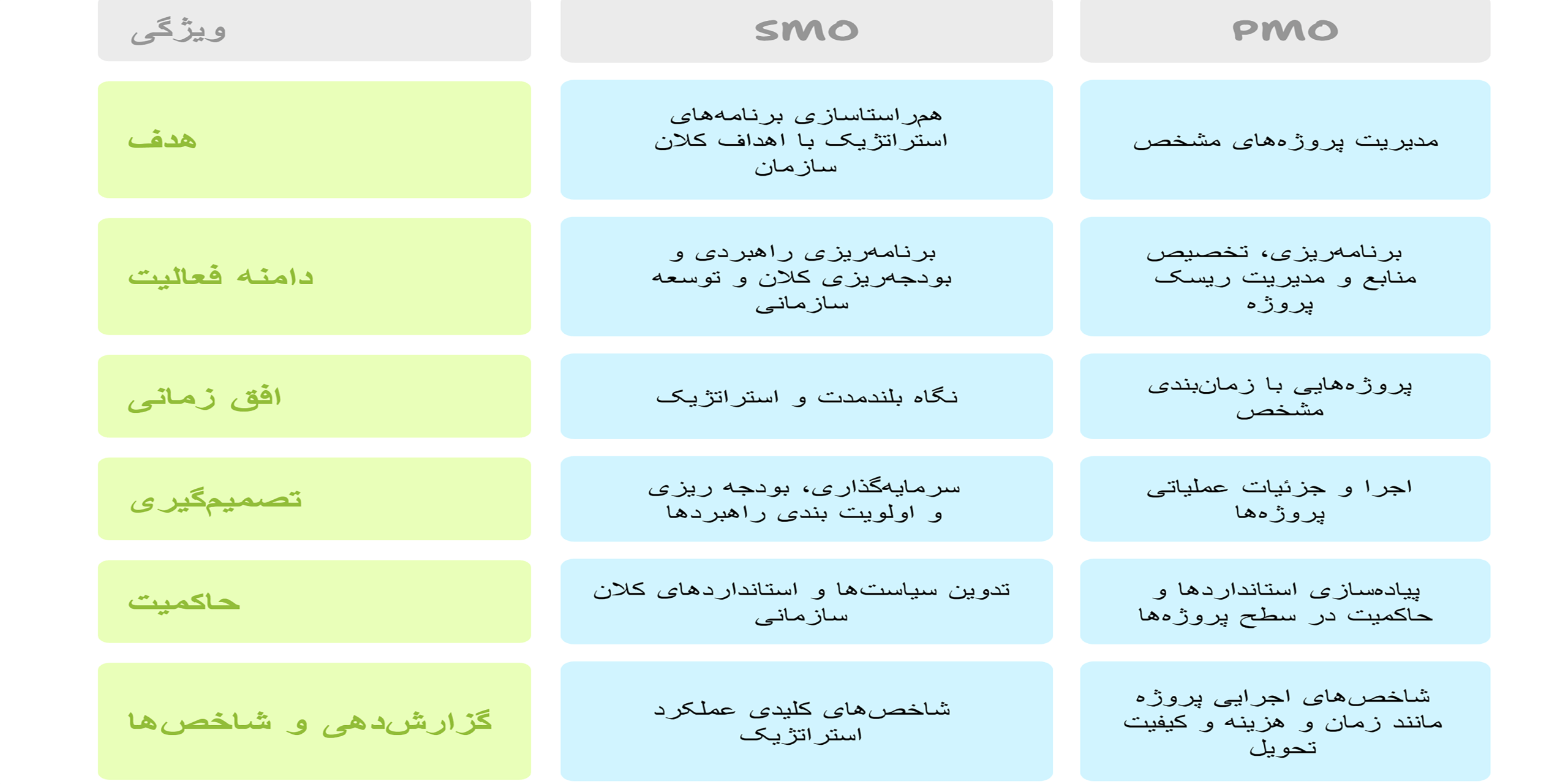 دفتر مدیریت استراتژیک (SMO: Strategic Management Office) و دفتر مدیریت پروژه (PMO: Project Management Office) هر دو ساختارهای سازمانی هستند که نقشهای حیاتی در مدیریت و اجرای طرحها در شرکتها و سازمانها ایفا میکنند؛ البته آنها کارکردهای متفاوتی دارند و بر جنبههای متمایز سازمان تمرکز میکنند.